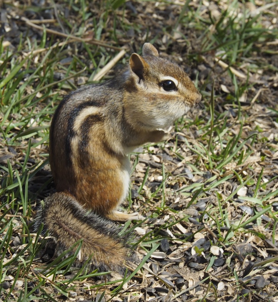 The chipmunks in our back yard are great signs of spring. They are ground squirrels, and are true hibernators. They spent much of the winter in a sort of suspended animation, with their heart rate slowed to just a few beats per minute (from their normal 350 beats per minute!) and their body temperature drops to just a few degrees above freezing. Every few days they wake up, warm up, pee and poop, eat some of the food they collected last fall, and go back to sleep. But now spring’s warmth has aroused them and they are very active! I’m always amazed by how many seeds they can stuff into their cheeks – it’s like they’ve got a couple of shopping bags to take home the groceries!