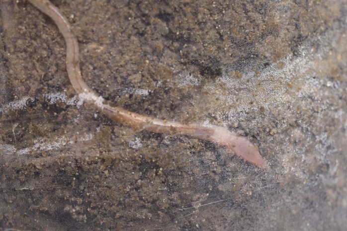 But they are fascinating creatures. Just behind their prostonium (front segment), they have a mouth. Larger earthworms like Lumbricus terrestris (also called night crawlers or dew worms) come to the surface at night and drag piles of leaves back to their hole. It’s easy to see these tiny piles; carefully shift one and you will uncover the hole.