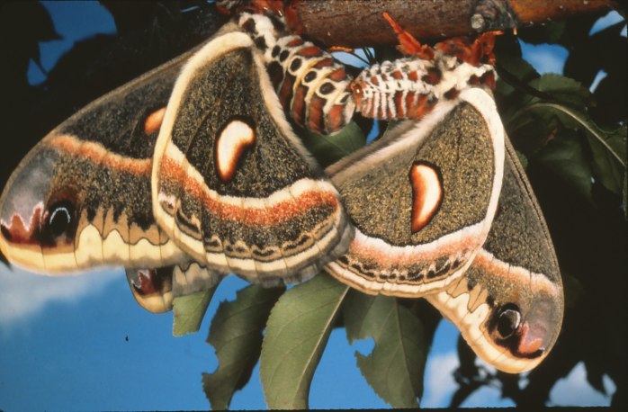 In southern Ontario, June is the month for Giant Silkmoths to emerge! Since late last summer, all through the winter and most of the spring, they are in the pupa stage of development, wrapped in silken cocoons. Finally, in late spring, the adult moths push their way out of the cocoon, climb up a bit and pump fluids into their wings. They are beautiful and very big – the Cecropia is the largest moth north of Mexico! Polyphemus, Luna and Promethea are other Giant Silkmoths in our area (southern Ontario).