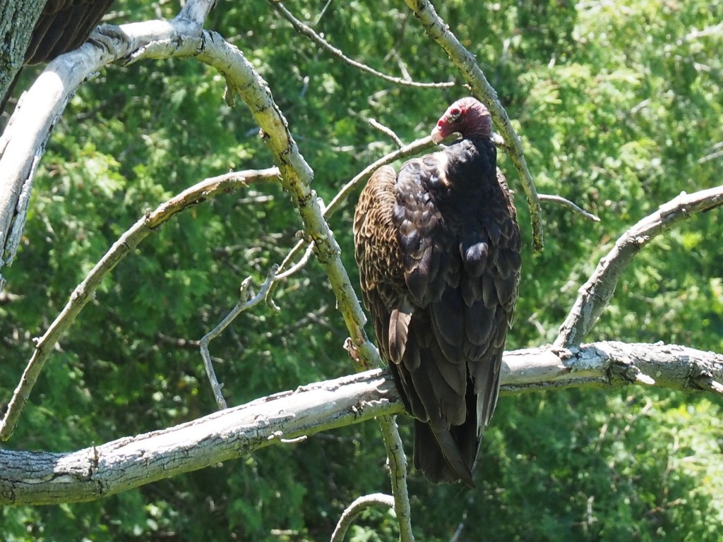 Turkey Vultures are AMAZING to watch. Their flight seems effortless; they hardly every flap their wings and use updrafts from cliff areas and sun-heated ground to patrol the skies. They’re on the lookout for dead animals, so they are a valuable part of nature’s cleanup crew. If you see what looks like a black hawk soaring it’s probably a turkey vulture. To stabilize themselves, they fly with their wings angled up just a bit in a shallow V (jet aircraft also have this). Feathers splay out at wingtips to reduce drag during flight. And they rock back and forth as they fly, reacting to air turbulence. With their fairly light bodies and large wings, they have the lightest wing-loading (ratio of body weight to wing surface) of all of our raptors (birds of prey), which helps them stay in the air without using much energy.