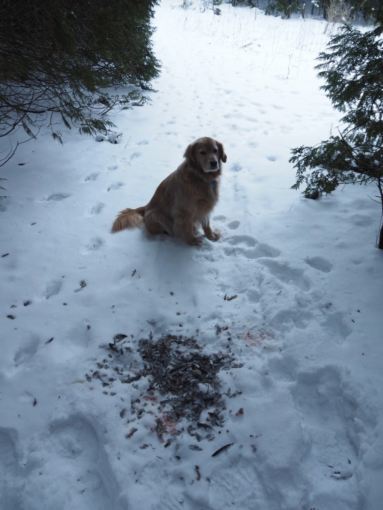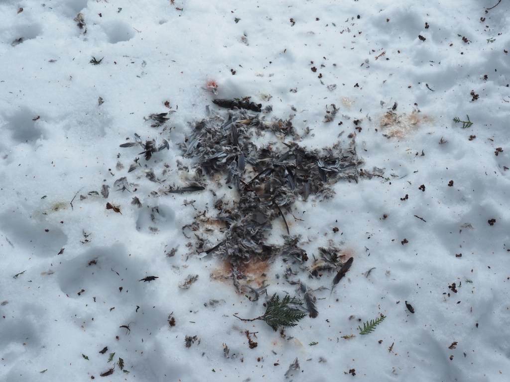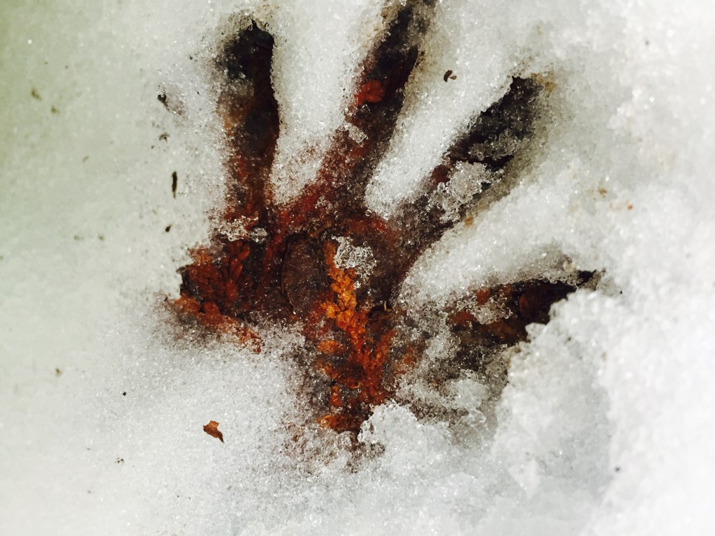 And sometimes you discover high drama. A mouse’s life ended in the talons of a hawk or owl; you know that because of the small trail which ends suddenly where the imprint of large wingtips stripe the snow. Another time you happen upon an unlucky rabbit’s remains, surrounded by red-stained snow and coyote tracks. I call some of these discoveries “murder mysteries,” but with respect since we are viewing nature’s circle of life, the food chain in action.