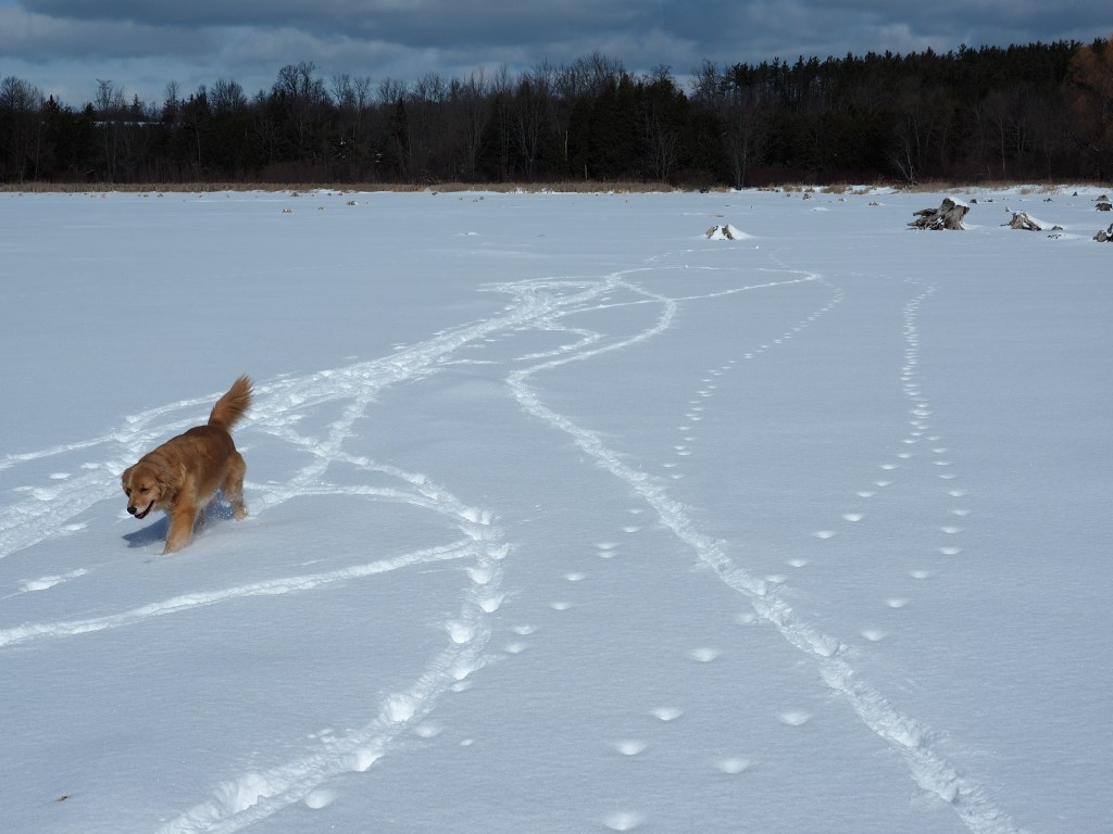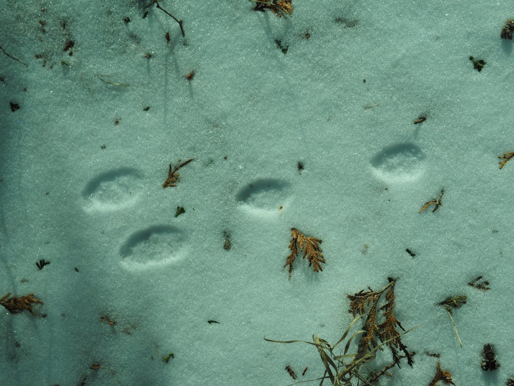 And then there are the look-alikes. To tell coyote and fox from dog, check the behaviour of the animal. If the tracks go here, there and everywhere, it’s an off-leash dog (no need to save energy!); if the tracks go more or less straight for a good stretch, it’s a coyote or fox, eating up the kilometres with an efficient trot, not deviating unless there is evidence of potential food.